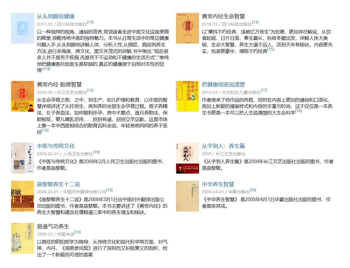 在著作方面,曲黎敏独著了9部书籍:《中医与传统文化》,《黄帝内经养生智慧》,《曲黎敏养生十二说》,《黄帝内经生命智慧》,《黄帝内经胎育智慧》,《从头到脚说健康》,《把健康彻底说清楚》,《从字到人养生篇》等。