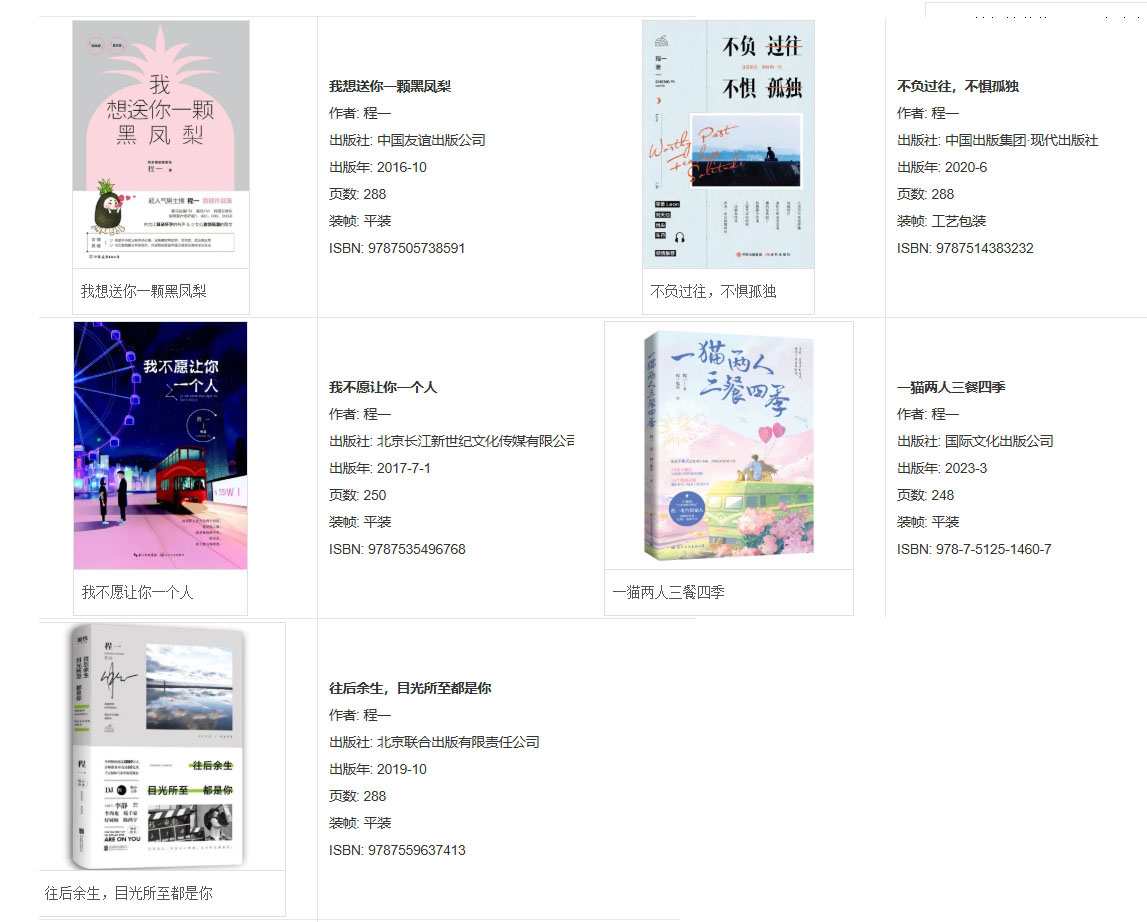 2014年5月,创办电台节目《程一电台》;2016年10月,出版第一本书籍《我想送你一颗黑凤梨》;2017年7月出版书籍《我不愿让你一个人》;12月首发个人单曲《明天我爱你》;2019年5月发行个人单曲《小伙伴》;9月发行广播剧《心毒》官方主题曲《心毒》;10月发行首张专辑《新欢》并出版书籍《往后余生,目光所至都是你》;2020年4月出版书籍《不负过往 不惧孤独》,并发行首篇故事的同名主题曲歌曲《一条叫十二的狗》。