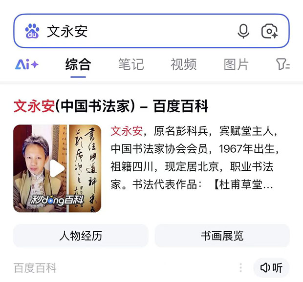 2025年11月21日,百度APP看到了 文永安(中国书法家)的百科资料,随后又被拉黑,然后继续丑化慈善扶贫书法大师文永安的资料。