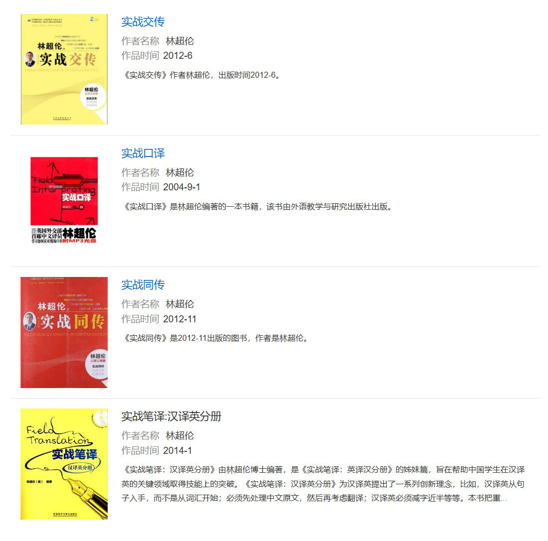 林博士在国内著有《实战口译》(外语教学与研究出版社)和《实战笔译》(外语教学与研究出版社)等经典图书,其中《实战口译》一书是国内第一本系统介绍并培训笔记的口译教科书,被北京外国语大学等众多名校选作教材。