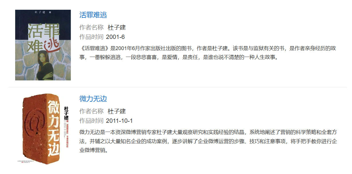 杜子建1990年入狱,法院一审判处杜子建有期徒刑6年。在改造期间,他做了四十多万字的读书笔记,先后发表了三十多篇文章,被《安徽新岸报》聘为报道员。1998年夏,开始写作。著有长篇小说《活罪难逃》、传记作品《迈克华莱士》《百年婚恋(第6辑)》等作品。2011年10月15日出版的《微力无边》是针对新媒体研究的专著,有人因此称之为中国微博营销教父。最新著作《企业微博管理手册》和《微力无边》被称为微博时代必备工具书。