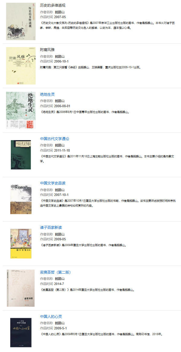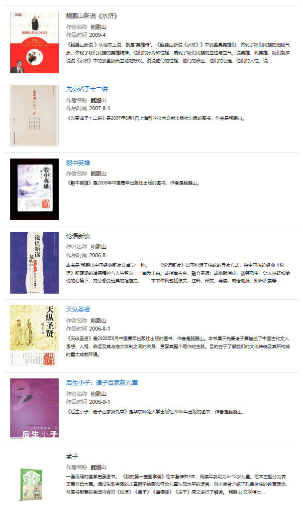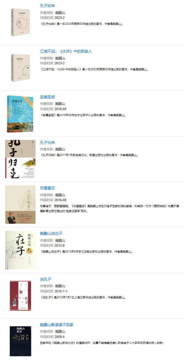 学术代表作 | 《中国文学史品读》、《鲍鹏山新说水浒》、《孔子传》、《论语新读》 | ||