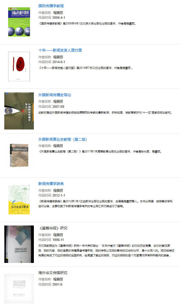 教材《世界新闻传播史》(国家级重点教材,主编之一),中国人民人学出版社2000年出版。